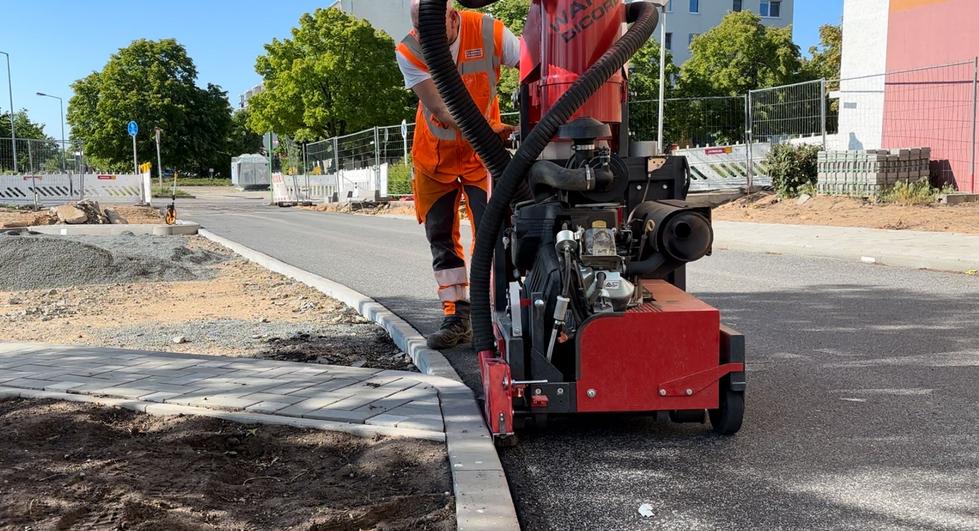 Mit einer Rissfräse wird ein wild in der Straße verlaufender Riss mit einer speziellen, v-förmigen Diamantfrässcheibe auf den gesunden Untergrund ausgefräst und anschließend mit heißer Bitumenvergussmasse verfüllt. Die Frästiefe liegt bei ca. 25-30mm, bei einer Breite von 15mm. Der dabei entstehende Staub wird mit einer kraftvollen Trockenabsaugung während des Fräsvorgangs abgesaugt und in einem Staubbehälter gesammelt. Mit den Rissfräsen DICOREL 2030 & 2010S kann aufgrund der flexiblen Lenkung dem Verlauf des Risses exakt gefolgt werden. Somit eignen sich diese Modelle auch bestens als Fugenschneider. Der ausgefräste Riss bzw. die ausgefräste Fuge ist trocken und sauber. Anschließend wird dieser mit einem ebenso handlichen Vergusskocher - der DICOREL 3001 - verfüllt. Eine Rissfräse mit Absaugung zeichnet sich dadurch aus, dass ohne Wasser gearbeitet und der Staub während des Fräsvorgangs abgesaugt wird. Dies schützt demnach Mensch, Maschine und Anwohner.